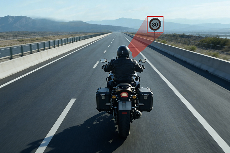 TSR(Traffic Sign Recognition)交通标志识别功能,在开阔的高速公路上,摩托车正平稳巡航,右侧的限速 80 交通标志清晰可见,而摩托车的TSR 交通标志识别系统早已精准捕捉到这一信息:前视摄像头实时扫描前方路况,通过 AI 算法快速识别出限速标志的类型与数值,将 “80km/h” 的限速信息同步显示在仪表盘上,同时结合当前车速进行智能判断 —— 若骑行者不慎接近或超过限速阈值,系统将通过视觉或听觉方式发出提醒,让每一段高速巡航都在合规的节奏中前行,无需再分心留意路边的交通标志,专注享受驰骋的乐趣。